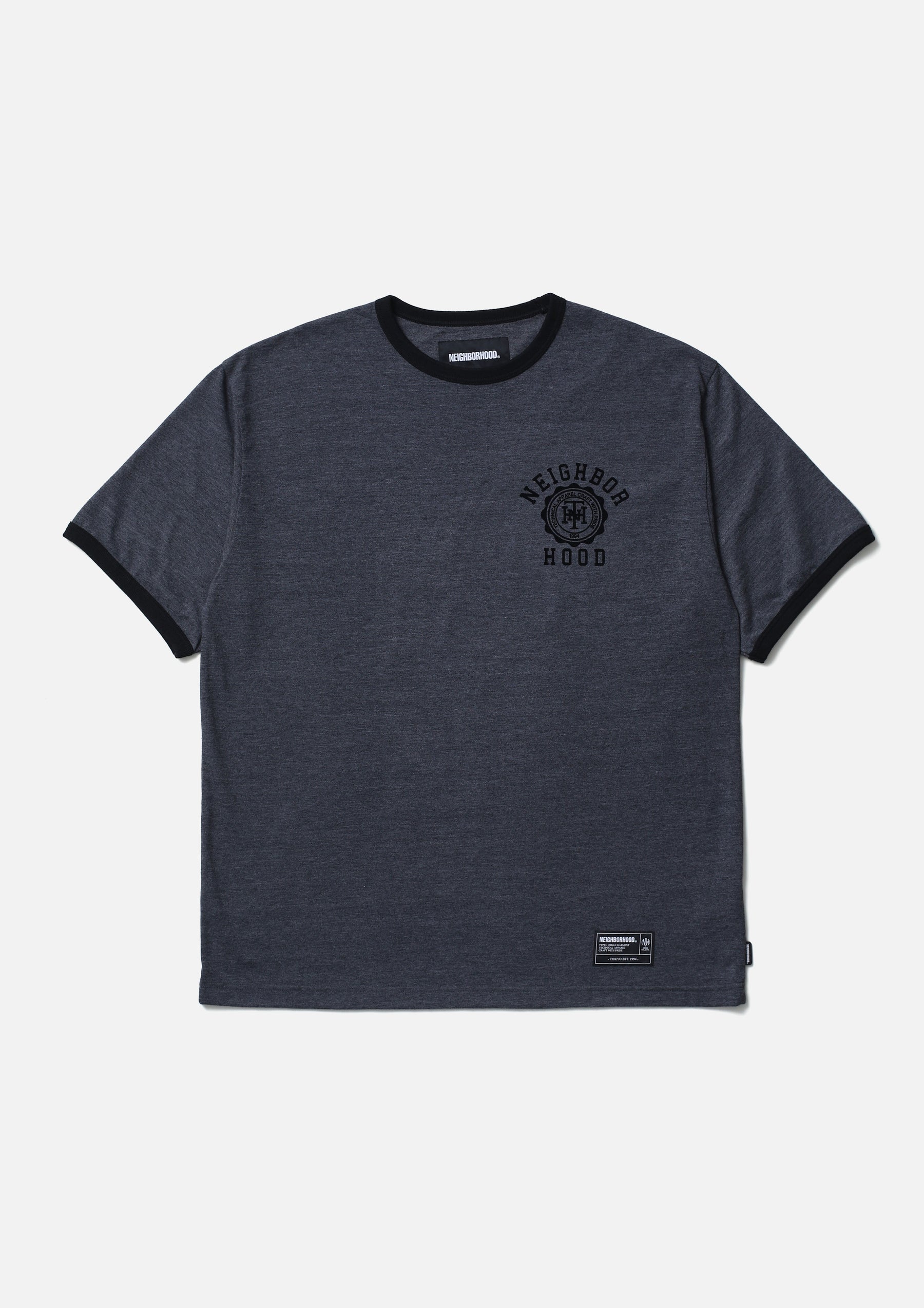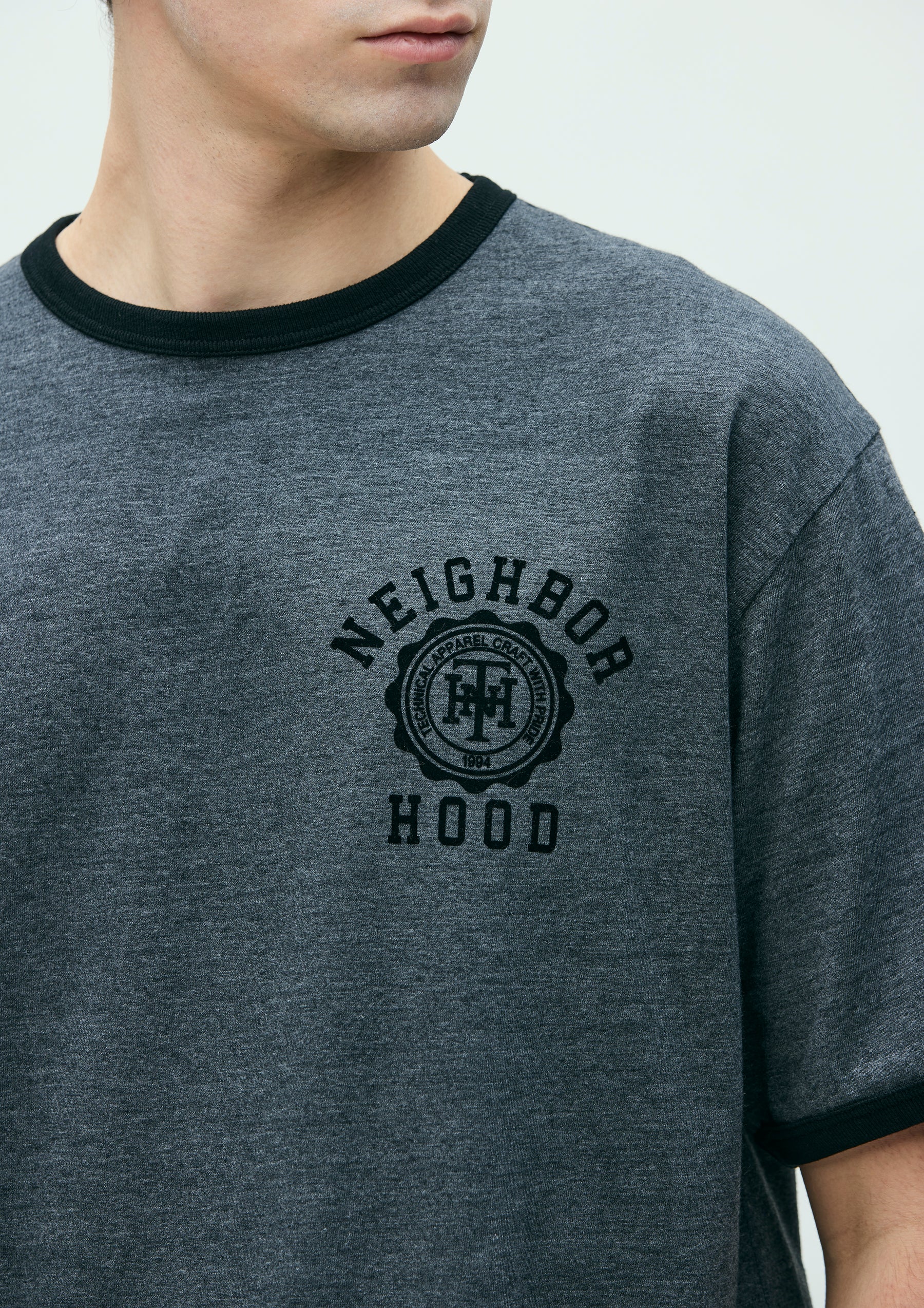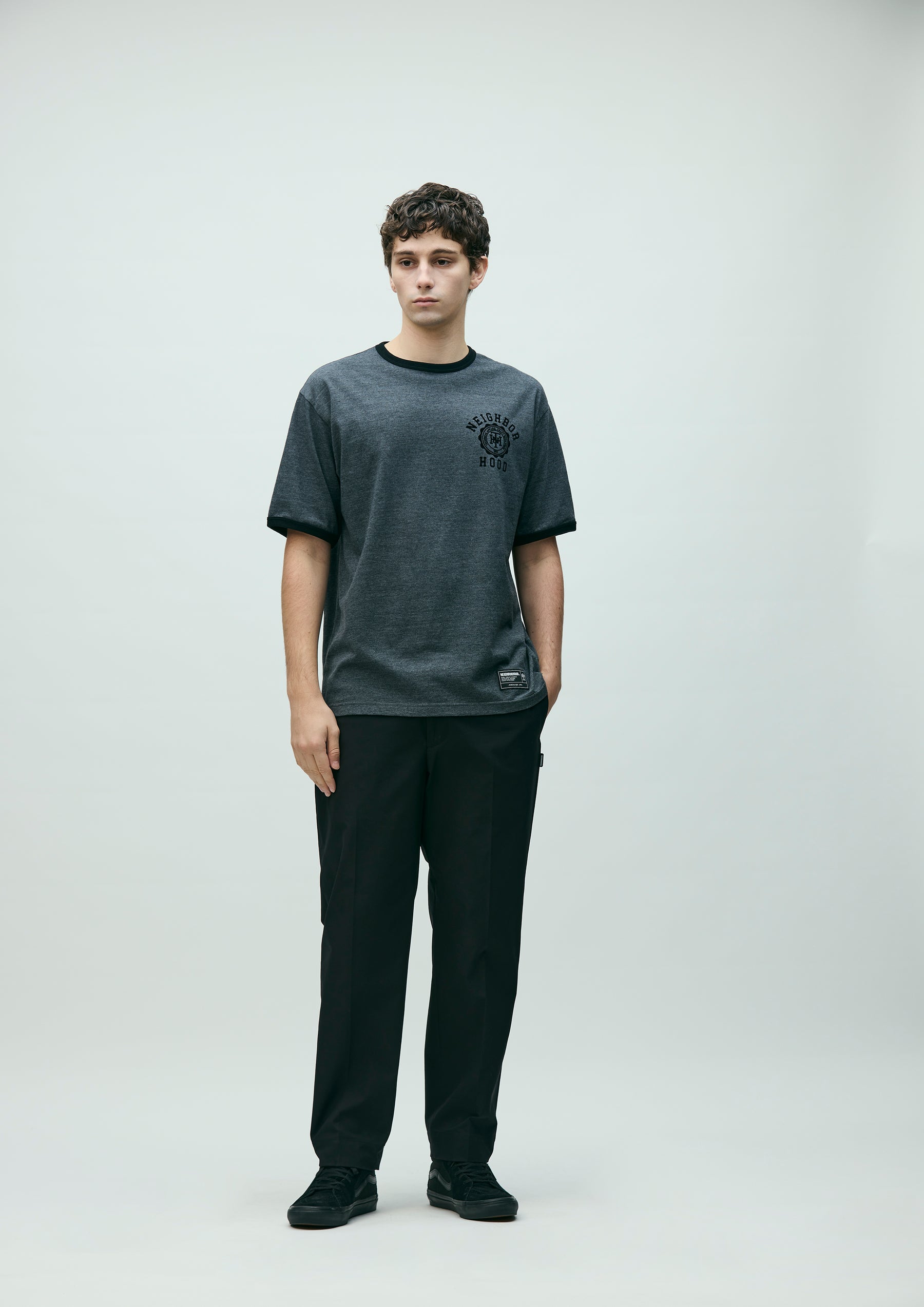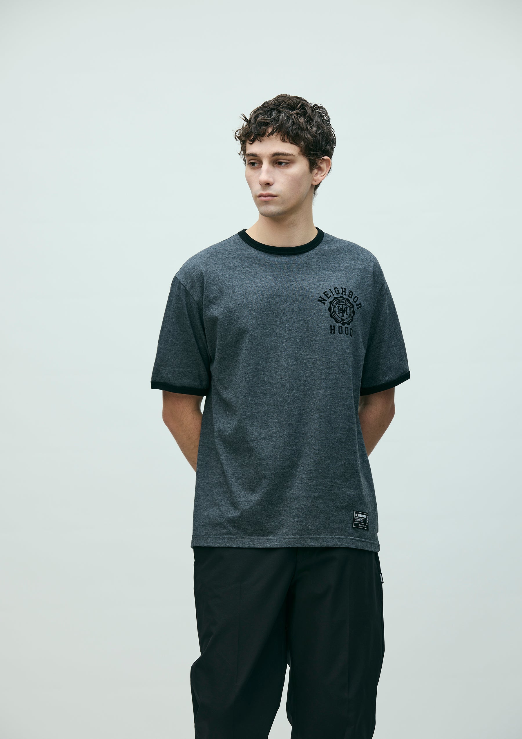 Short-sleeve crewneck cut-and-sew top made from eco jersey fabric. Features a flock-printed logo on the left chest. A brand tag is placed at the left hem, and a woven side label is attached at the side seam. Completed with a one-wash finish.