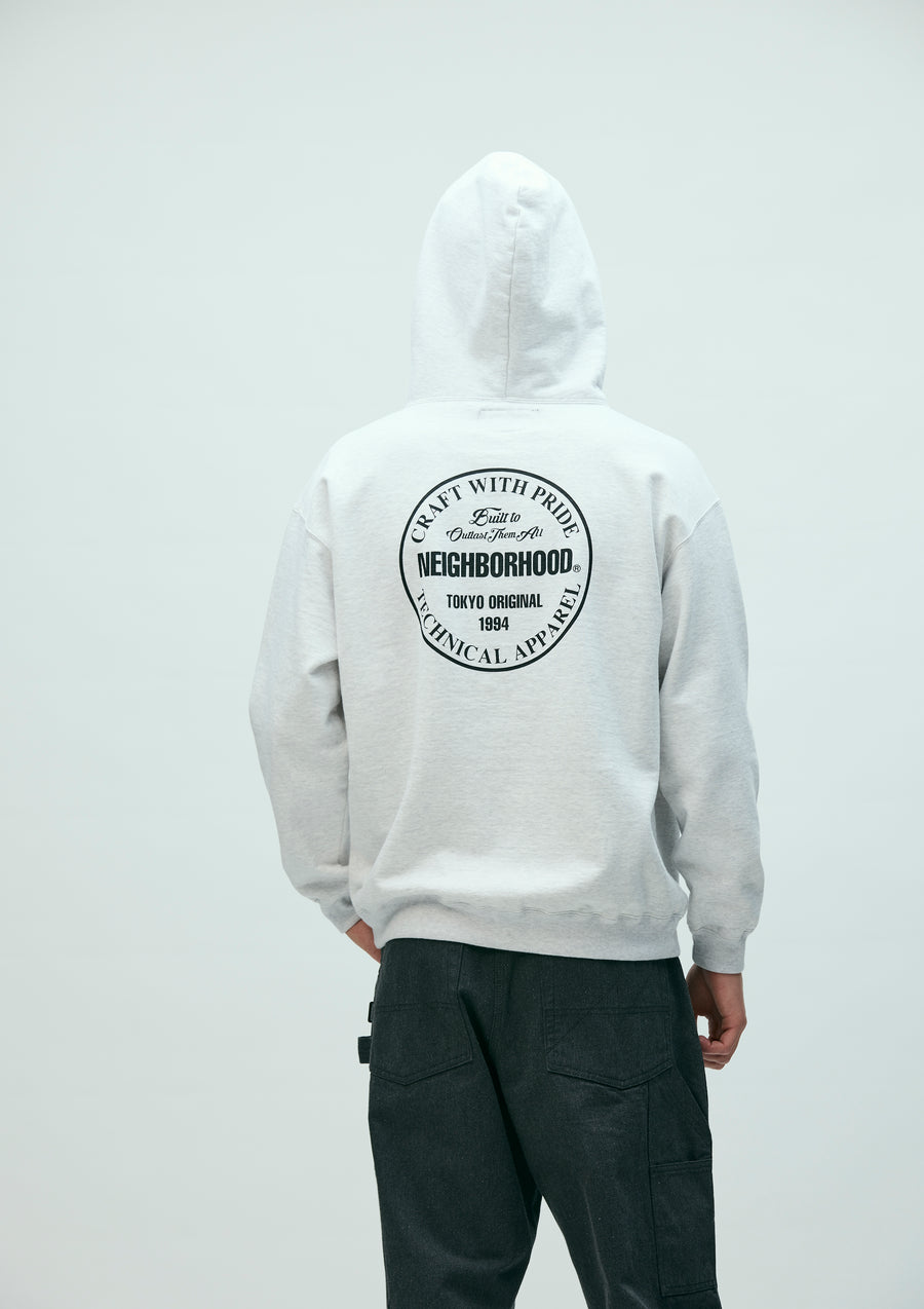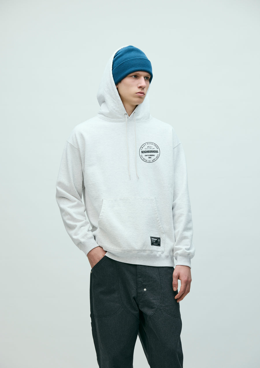 Pullover hoodie made from medium-weight cotton fleece fabric. Features printed logos on the left chest and back, with an original adjustable drawcord at the hood. A brand tag is placed at the left hem, and a woven side label is attached at the side seam. Completed with a one-wash finish.