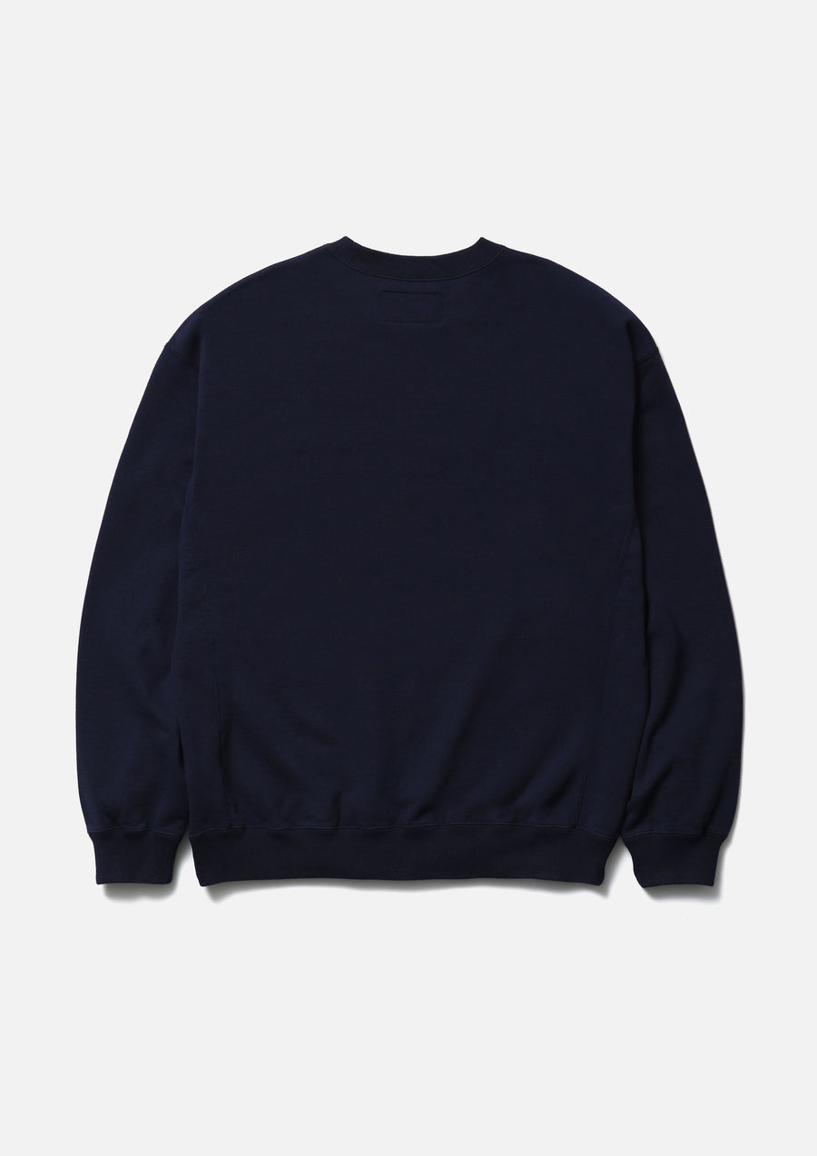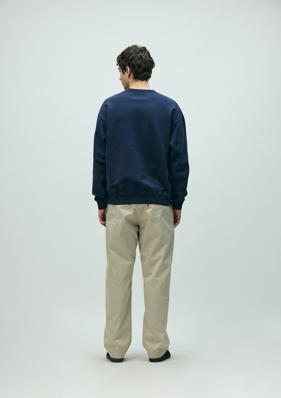 Crewneck pullover made from fleece fabric spun with organic cotton. Features an embroidered logo on the left chest. A brand tag is placed at the left hem, and a woven side label is attached at the cuff. Completed with a one-wash finish.