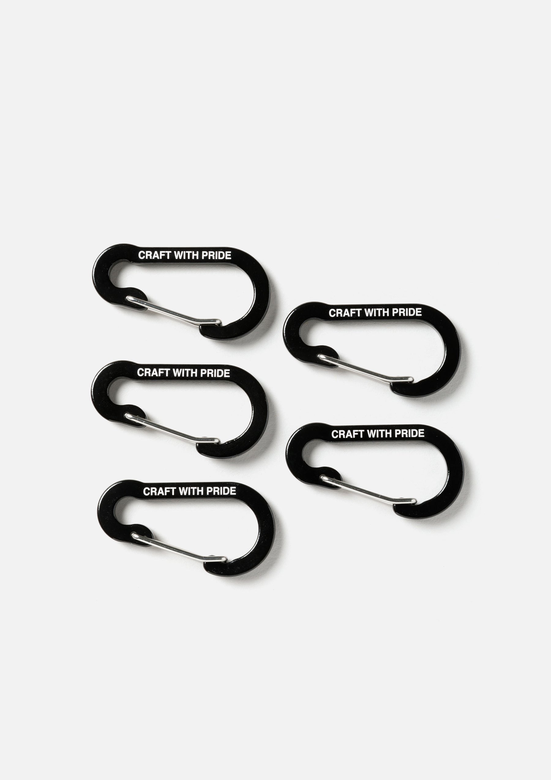 Lightweight aluminum carabiner with laser-engraved graphics on both sides. Sold as a set of five.