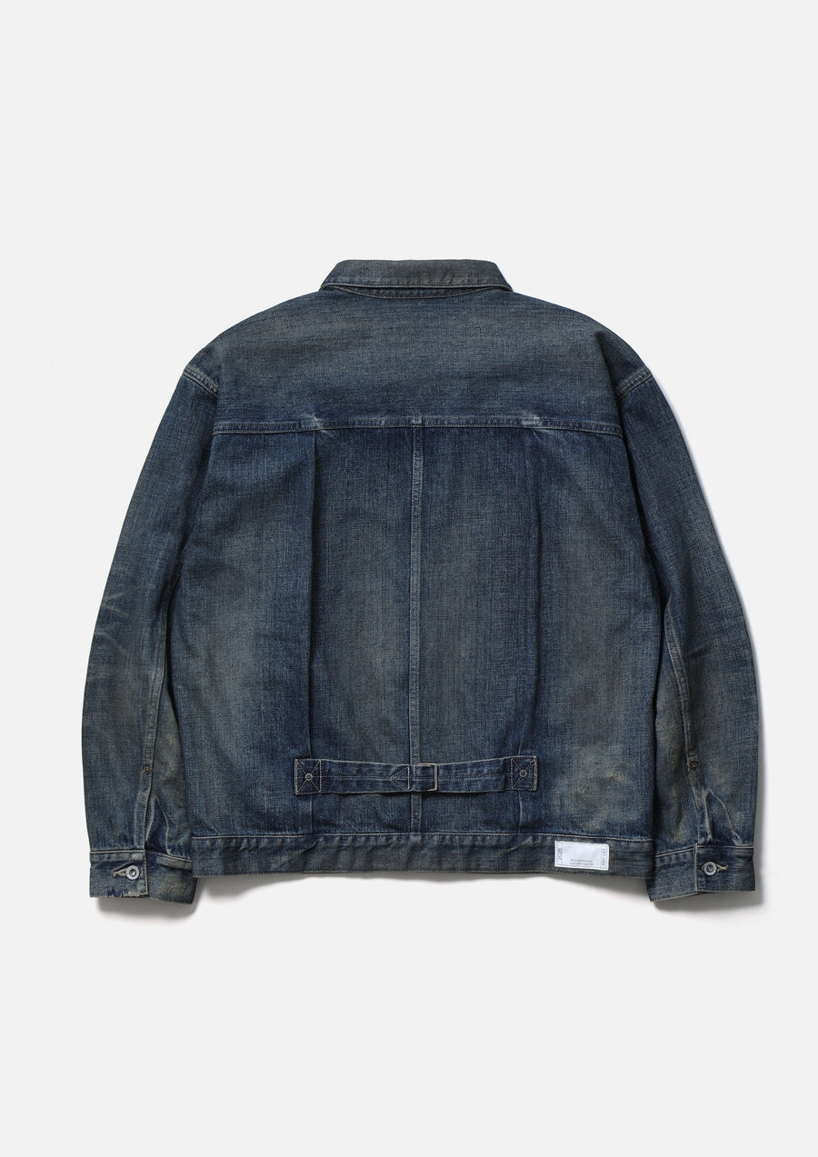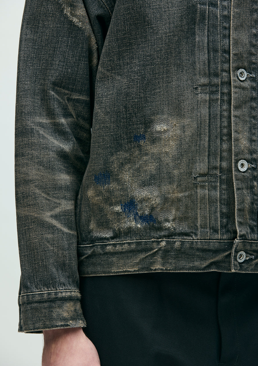 1st-type savage denim jacket made from original 12oz denim fabric, finished with a savage treatment. Characterized by realistic aging through damage processing, repair detailing, and heavy fading to express fabric degradation. Features decorative details such as White Hearts beads and hand embroidery on the chest pocket opening, along with contrast piping tape. Finished with original tack buttons and rivets. Equipped with a size label exclusive to the Custom Crafted line, and a woven side label at the side seam.