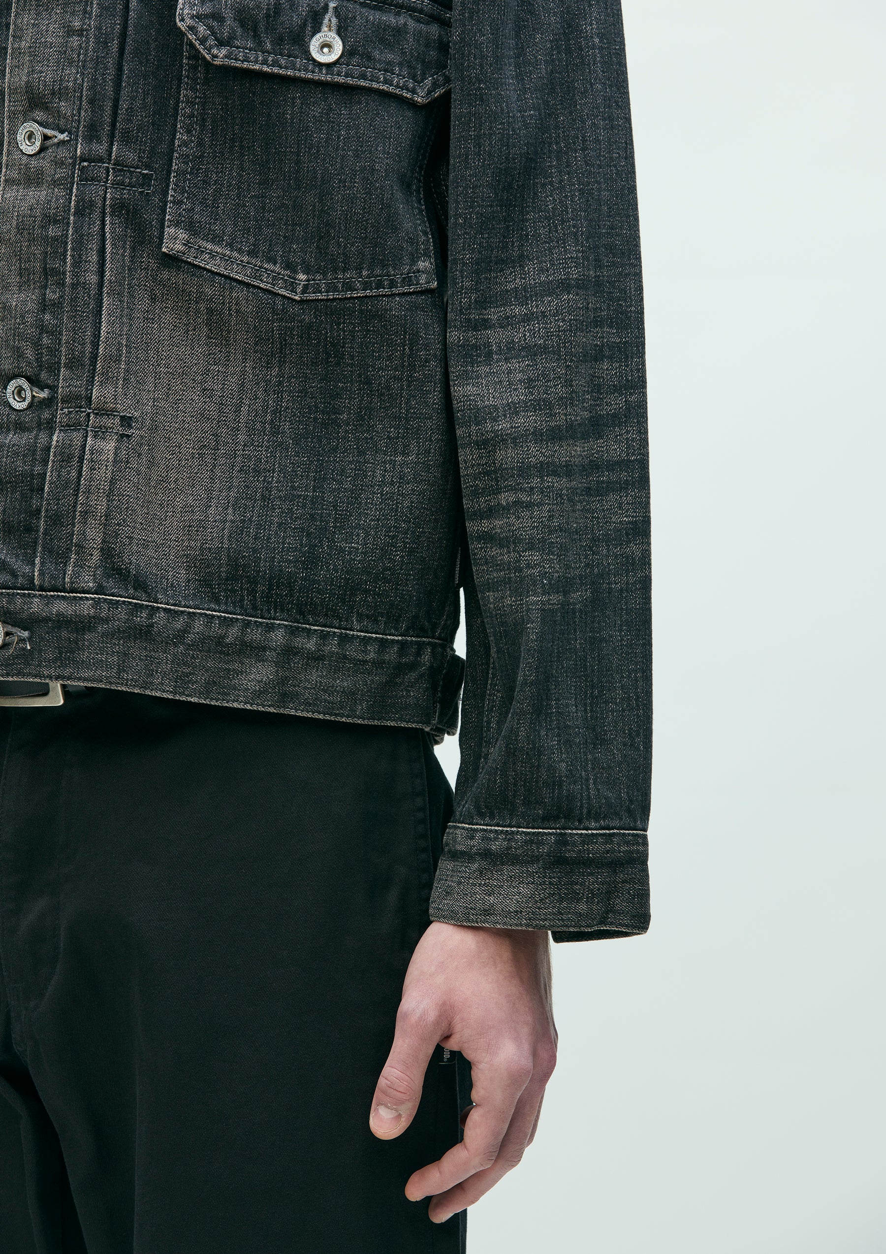 2nd-type denim jacket made from original 12oz denim fabric with a washed finish. Realistic aging is reproduced through a combination of treatments including natural fading and distressing. Features contrast stitching throughout. Finished with original tack buttons and rivets. Equipped with a size label exclusive to the Custom Crafted line, and a woven side label at the side seam.