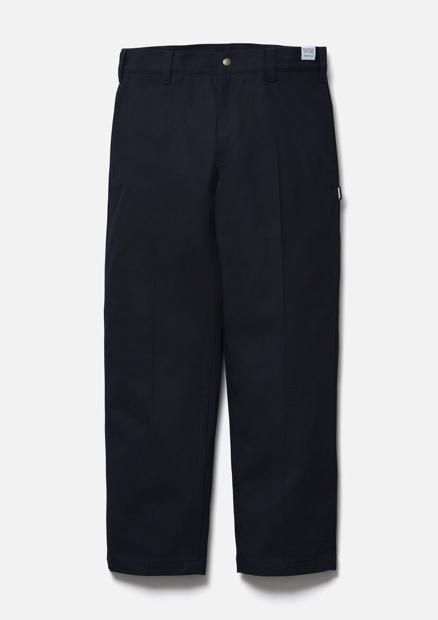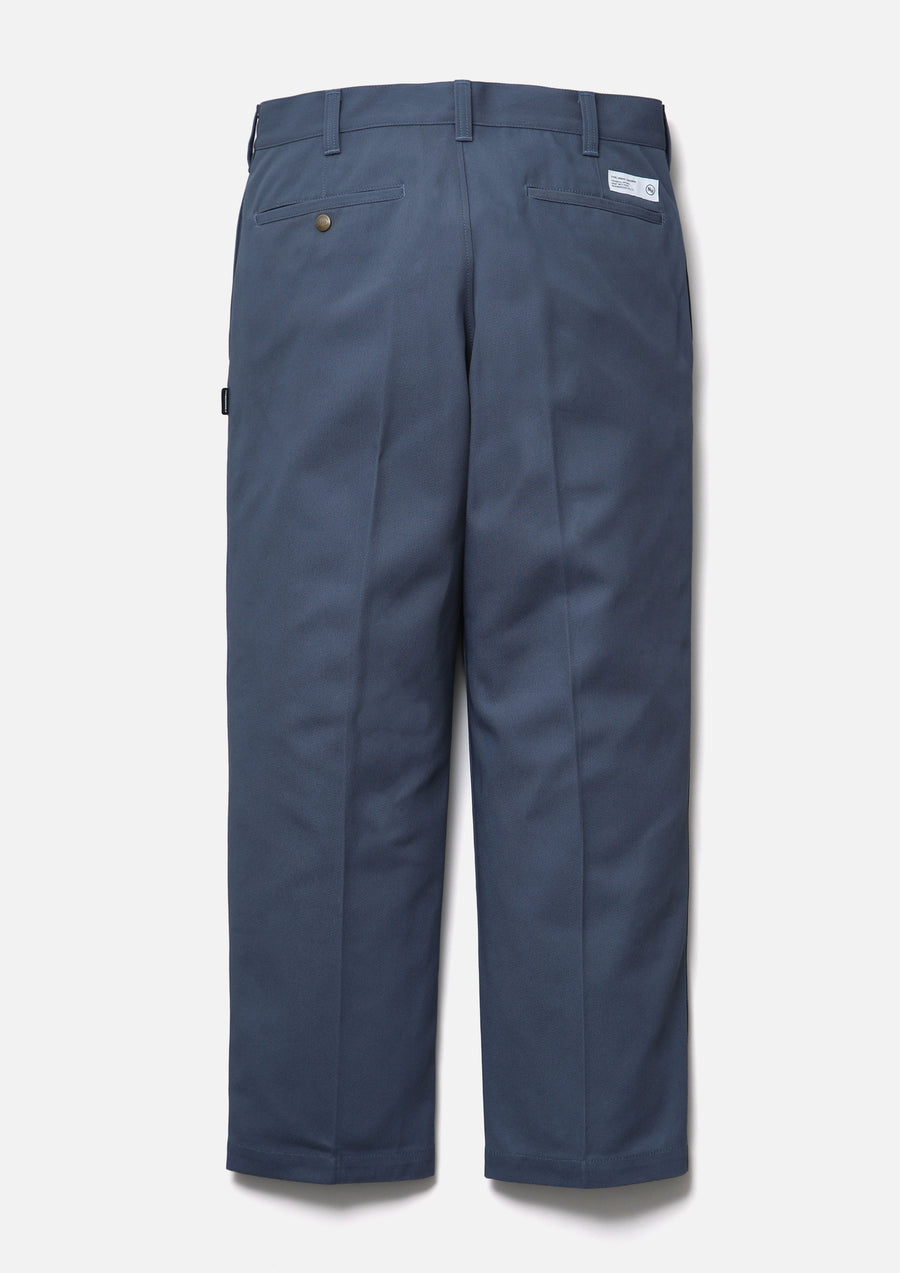 Work pants made from Katsuragi fabric twill woven with thick, strongly twisted yarn. Cut in a clean, streamlined silhouette. Finished with original snap buttons and pocketing fabric. Brand tags are placed at the waist and above the back pocket, with a woven side label at the side seam.