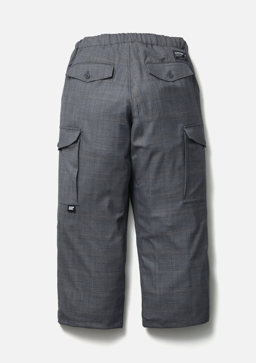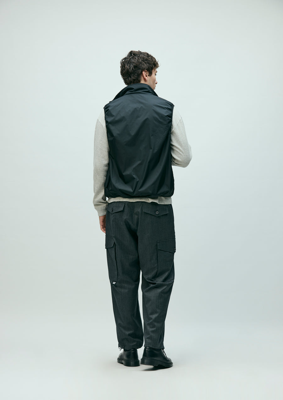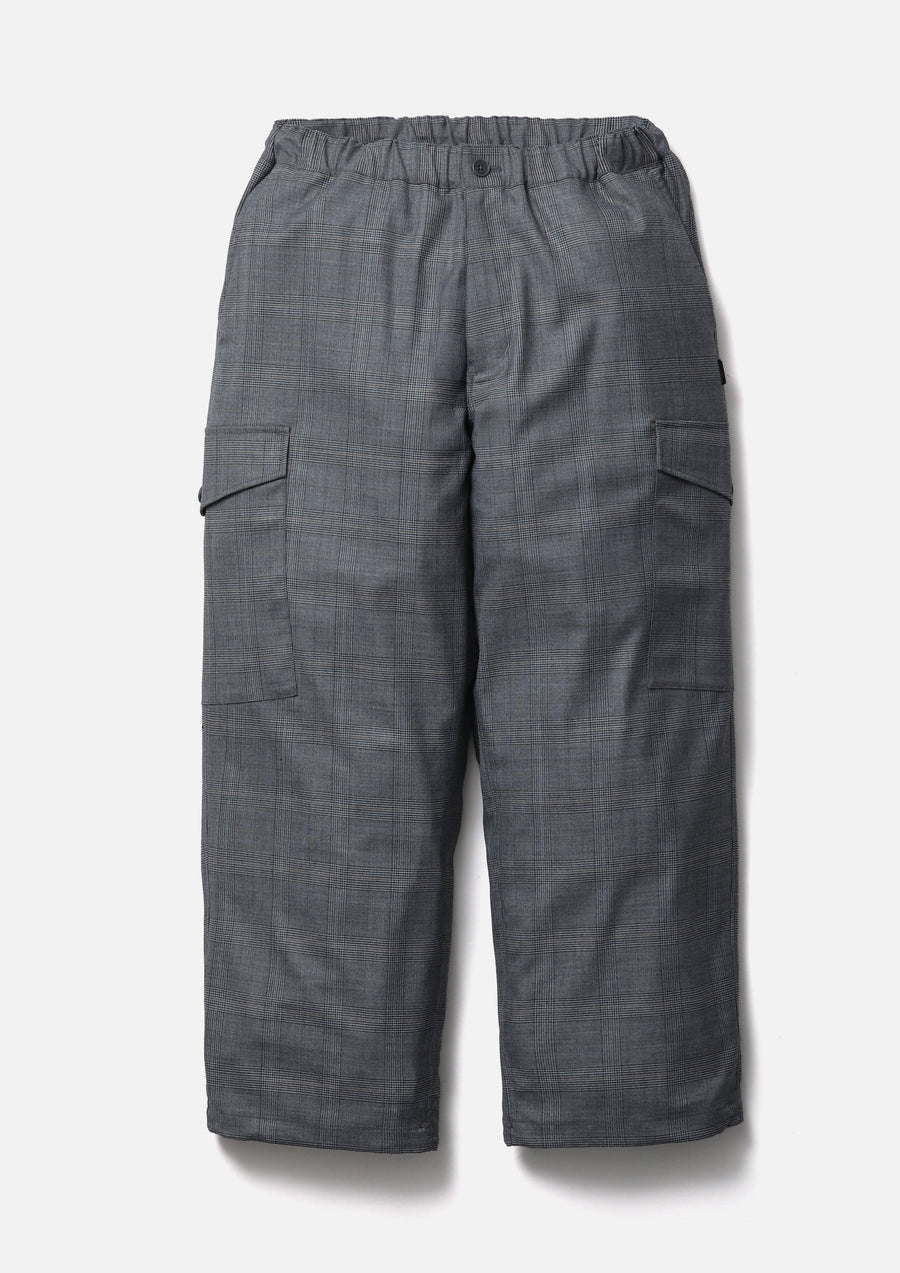 Wide cargo pants crafted from a washable wool blend. Designed with gusseted cargo pockets on both sides, an elastic waistband with an internal drawcord, and adjustable drawcords at the hems. Finished with original buttons, zipper pulls, and signature tape. Brand tags are placed on the cargo pockets and above the back flap pocket, with a woven side label at the side seam.